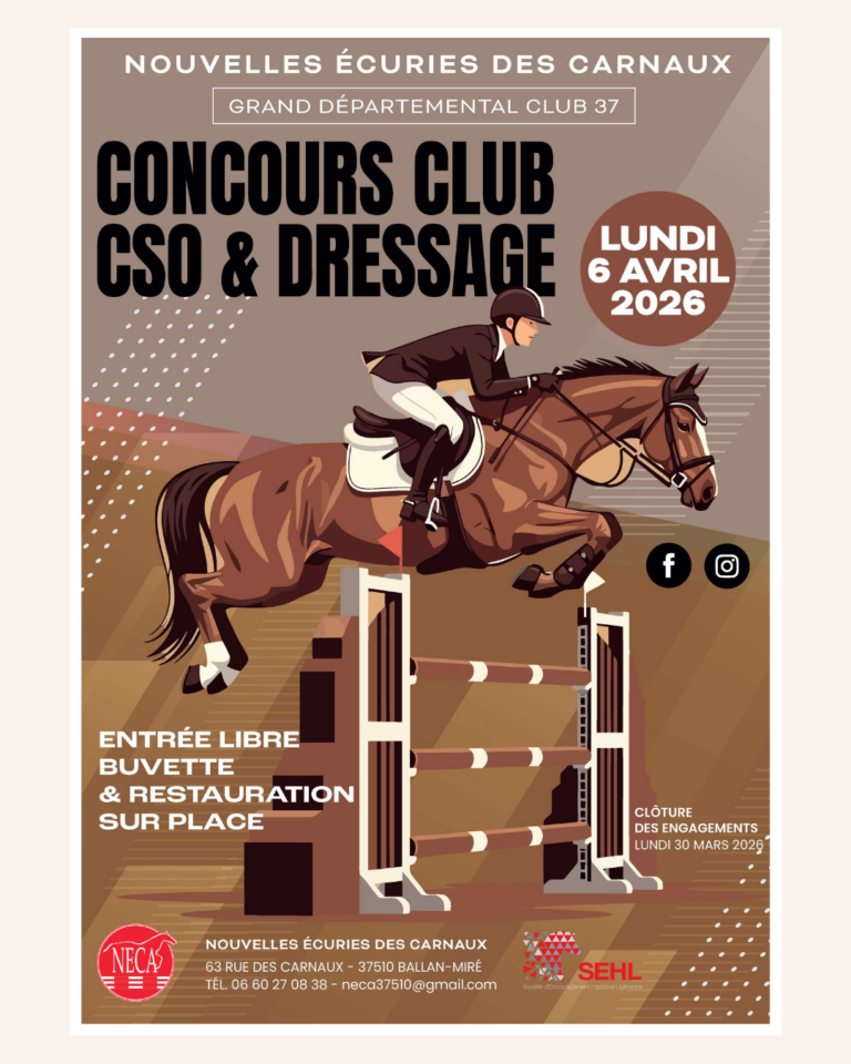 Du 13 au 17 avril et du 20 au 24 avril 2026, aux Nouvelles Écuries des Carnaux. À la carte, journée, 1/2 journée ou plusieurs jours. Pour tous renseignements, contactez le 06 60 27 08 38 – neca37510@gmail.com